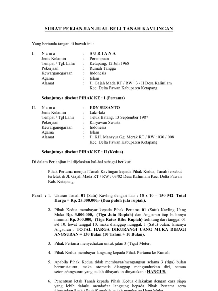 Anda tinggal mendownloadnya, lalu mengubah beberapa bagian pada surat jual beli tanah tersebut dalam editor. Surat jual beli tanah berfungsi sebagai bukti otentik dan mempunyai kekuatan hukum untuk menghindari modus penipuan ataupun sengketa yang akan terjadi ke depannya. Menjual tanah warisan tidak sama dengan menjual tanah biasa. Umumnya, surat kuasa digunakan sebagai bukti pemberian wewenang ke pada salah satu ahli waris untuk menjual. Surat jual beli tanah merupakan sebuah surat yang dibuat yang mana isi dari surat tersebut menginformasikan bahwasanya pada tanggal dan waktu tertentu telah dilakukan akad atau transaksi jual beli tanah antara pihak pertama dengan pihak kedua atau juga bisa disebut antara pihak penjual.
